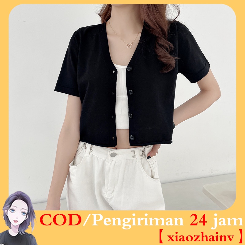 【xiaozhainv】Atasan crop top kardigan rajut sutra es tipis Korea V-neck lengan pendek